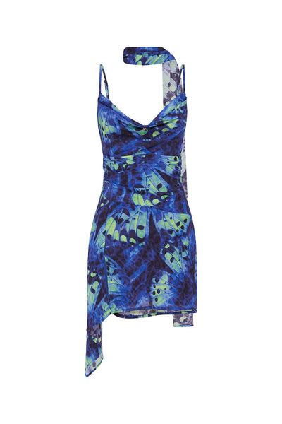 Our Alora Mini Dress will be your it girl look this summer, with an abstract, rich blue print, an asymmetrical hemline, sensual cowl neck and scarf.