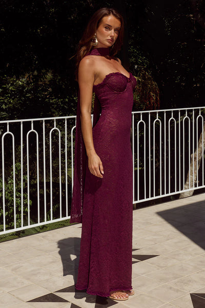 Elegant and effortlessly chic, the Amana Strapless Scarf Maxi Dress is a figure- flattering silhouette with delicate lace detailing and chiffon scarf wrap, perfect for your next wedding or special occassion.