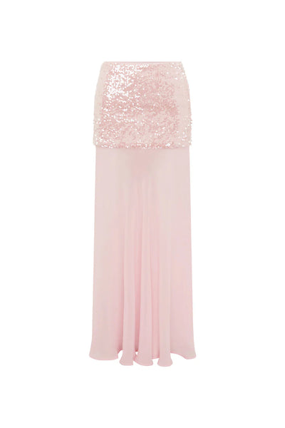 Sitting low on the waist with shimmering sequins and contrast chiffon fabric, our Adeluna Maxi Skirt will make a statement on your next night out, pair with our Adeluna Halter Top for the complete look.