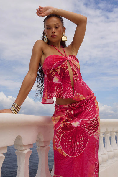 A flowing silhouette with beads and a bright, feminine orchid print, our Brandy Top is the perfect to bring out your feminine energy, pair with our Brandy Maxi Skirt for the complete look.