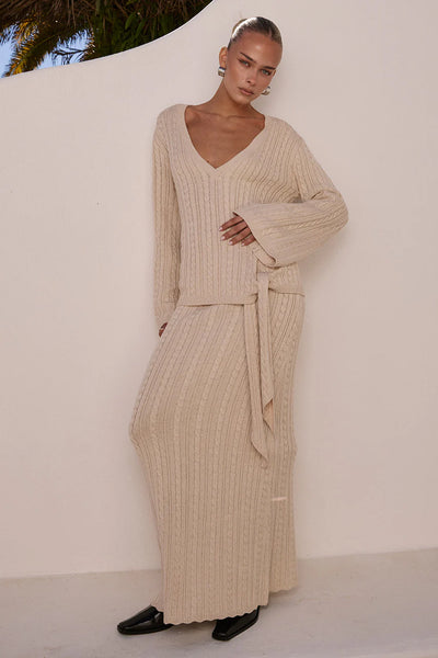 Slouchy and cool, our Ophelia Top is a beautiful layering piece or on it's own, crafted from a luxe cable knit with a tie detail and deep cut neckline. Pair with our Ophelia Maxi Skirt for the complete look.