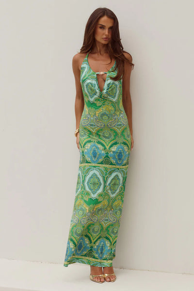 - Maxi length - Halter neck - Slip on style - Lined to hip with stretch - Body: 92% Polyester & 8% Elastane, Lining: 95% Polyester & 5% Elastane